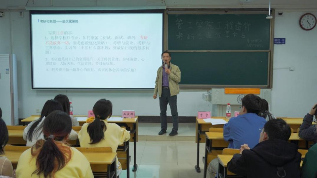 在教D105、D107、D108、D110分专业举办“研途鎏金·一研为定”七彩青话考研经验交流分享会。各专业系(室)主任、辅导员代表、优秀考研学生代表及2023级学生参加本次活动。